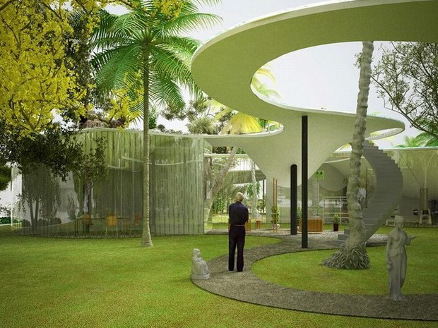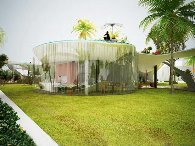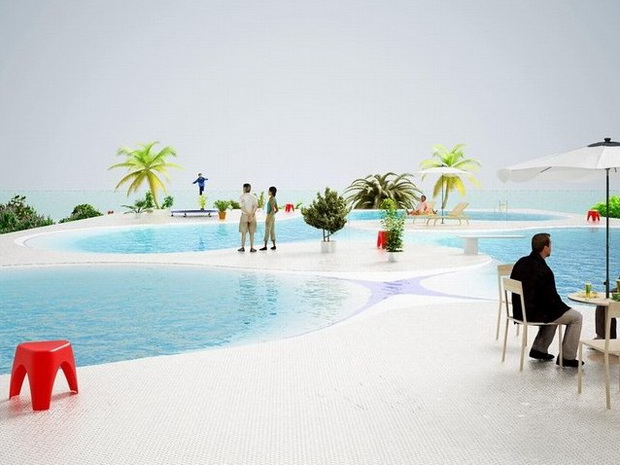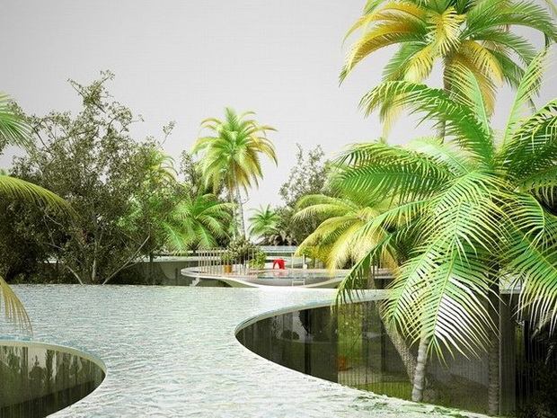 來自荷蘭的NLarchitects建筑事務所總能為我們帶來不一樣的新奇想法,很快他們設想了三個方案。都是將泳池架設在住宅的屋頂,房子的生活區位于泳池下面,以通透的玻璃幕墻圍合。通過泳池的不同形狀與深度劃分出下面的空間,上面的泳池儼然成為一個水上樂園!